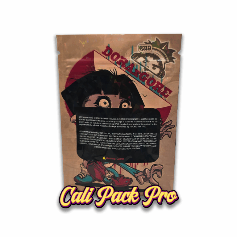 Dora Gore 3.5g Mylar Bag available in 1g, 3.5g, 7g, 14g, 28g, 112g, 224g, 448g, Food Grade PET + Aluminum, Glossy, Heat Seal + Zip Lock, Dry Herbs, Coffee, Edibles, Food Items.