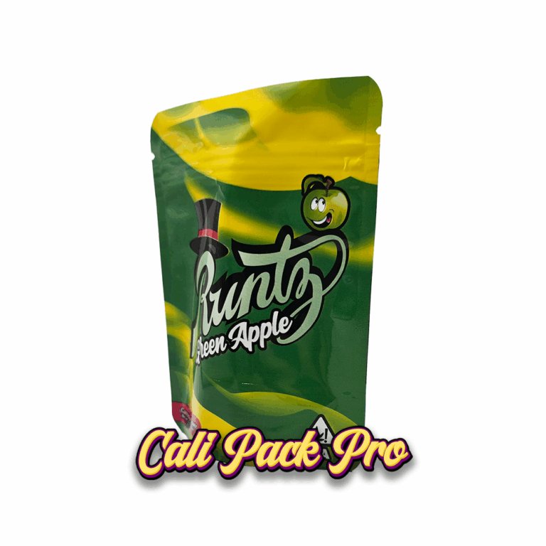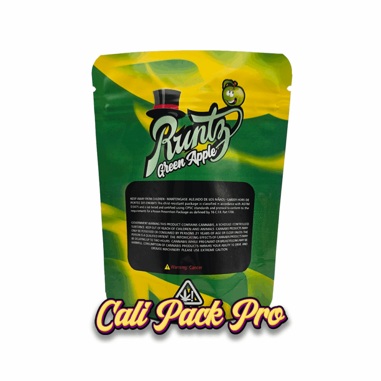Green Apple 3.5g Mylar Bag available in 1g, 3.5g, 7g, 14g, 28g, 112g, 224g, 448g, Food Grade PET + Aluminum, Glossy, Heat Seal + Zip Lock, Dry Herbs, Coffee, Edibles, Food Items.