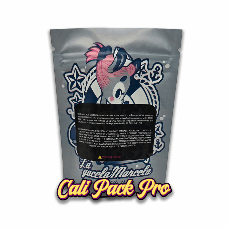 La Garcela Marcela 3.5g Mylar Bag available in 1g, 3.5g, 7g, 14g, 28g, 112g, 224g, 448g, Food Grade PET + Aluminum, Glossy, Heat Seal + Zip Lock, Dry Herbs, Coffee, Edibles, Food Items.