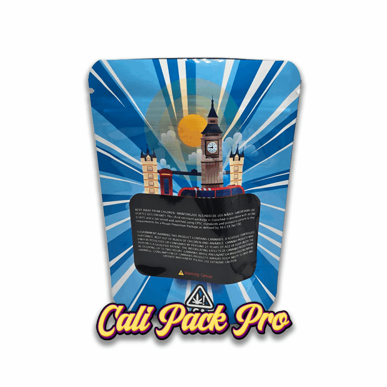 London Pound Cake 3.5g Mylar Bag available in 1g, 3.5g, 7g, 14g, 28g, 112g, 224g, 448g, Food Grade PET + Aluminum, Glossy, Heat Seal + Zip Lock, Dry Herbs, Coffee, Edibles, Food Items.