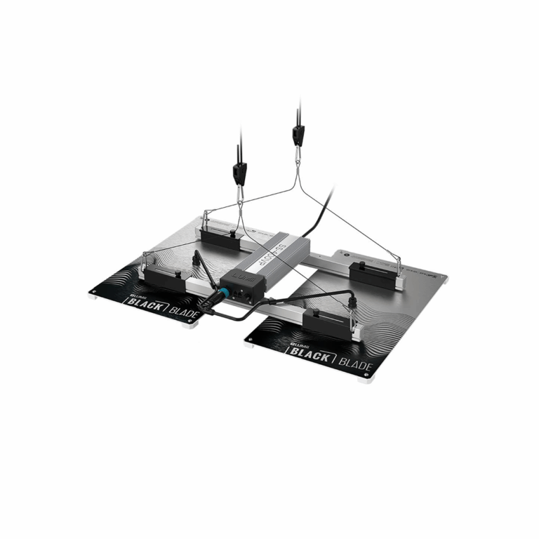 The LUMii BLACK Blade 400w LED is a cool-running and efficient plate-format LED alternative to 600 W HID lamps. Giving full, balanced spectrum 3500K white light with added 660nm Osram chips, it is the ideal light source for the entire plant lifecycle. Its 2-plate, adjustable design allows the fixture to be used to light a 90 cm x 90 cm tent or a larger tent up to 1.2 m2, and the plates can be set to give the optimum light spread over the growing area. There is provision for mounting a LUMii Black Bar 30w UV/FR LED between the adjustable plates to provide additional UV and Far-Red light if required. Dimmable using integral control and can be scheduled using a plug-in timer. Powered directly by mains electricity via the 2 m power lead supplied. Complete with hanging slings for easy installation. Â