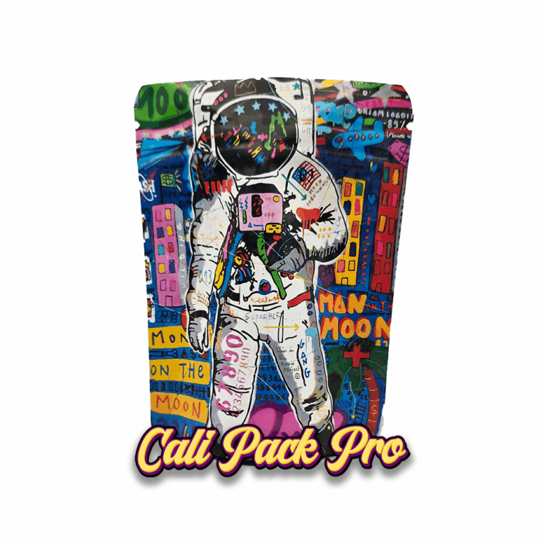 Man Moon 3.5g Mylar Bag available in 1g, 3.5g, 7g, 14g, 28g, 112g, 224g, 448g, Food Grade PET + Aluminum, Glossy, Heat Seal + Zip Lock, Dry Herbs, Coffee, Edibles, Food Items.