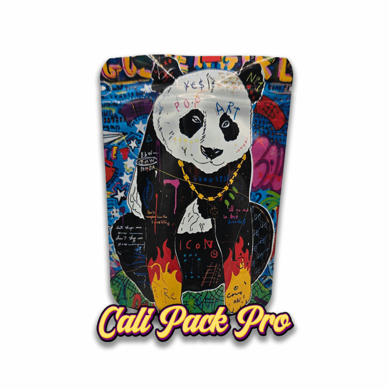 Panda Pop 3.5g Mylar Bag available in 1g, 3.5g, 7g, 14g, 28g, 112g, 224g, 448g, Food Grade PET + Aluminum, Glossy, Heat Seal + Zip Lock, Dry Herbs, Coffee, Edibles, Food Items.