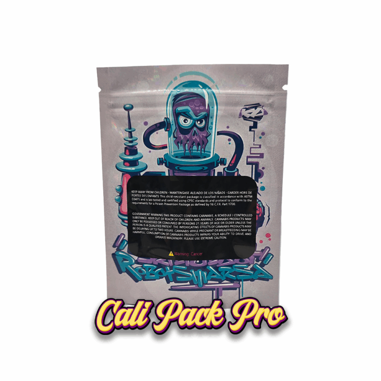 Robo Gelato 3.5g Mylar Bag available in 1g, 3.5g, 7g, 14g, 28g, 112g, 224g, 448g, Food Grade PET + Aluminum, Glossy, Heat Seal + Zip Lock, Dry Herbs, Coffee, Edibles, Food Items.