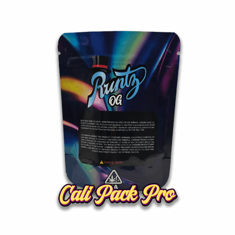 Runtz Black OG 3.5g Mylar Bag available in 1g, 3.5g, 7g, 14g, 28g, 112g, 224g, 448g, Food Grade PET + Aluminum, Glossy, Heat Seal + Zip Lock, Dry Herbs, Coffee, Edibles, Food Items.