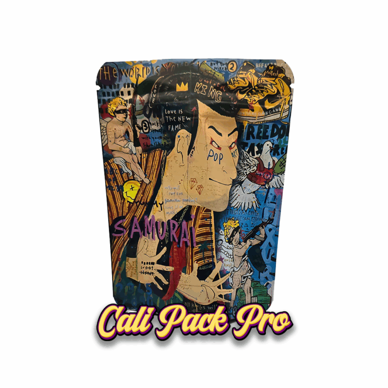 Samurai Jack 3.5g Mylar Bag available in 1g, 3.5g, 7g, 14g, 28g, 112g, 224g, 448g, Food Grade PET + Aluminum, Glossy, Heat Seal + Zip Lock, Dry Herbs, Coffee, Edibles, Food Items.