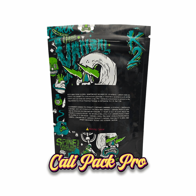The Vandal 3.5g Mylar Bag available in 1g, 3.5g, 7g, 14g, 28g, 112g, 224g, 448g, Food Grade PET + Aluminum, Glossy, Heat Seal + Zip Lock, Dry Herbs, Coffee, Edibles, Food Items.