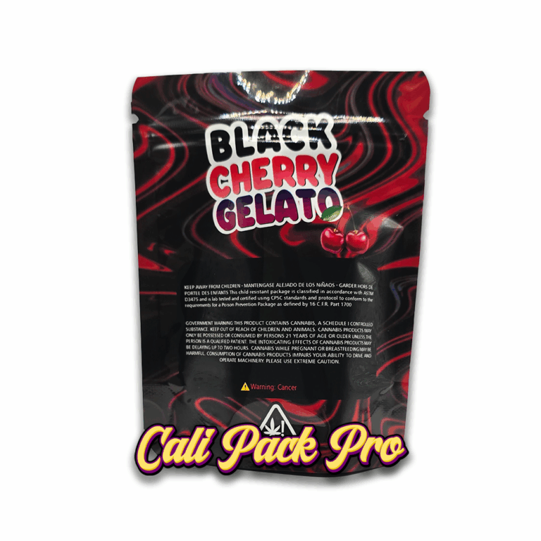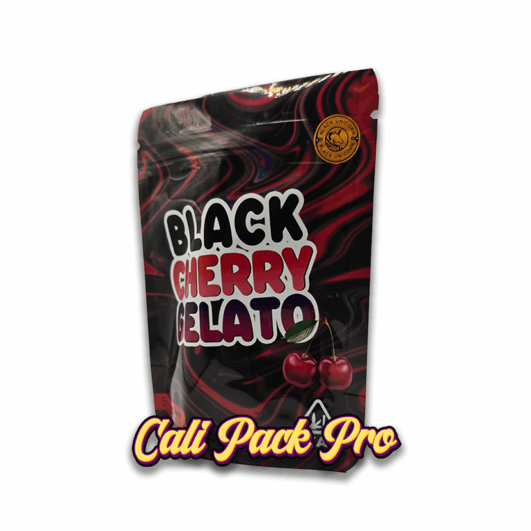 Black Cherry Gelato 3.5 mylar bag available in 1g, 3.5g, 7g, 14g, 28g, 112g, 224g, 448g, Food Grade PET + Aluminum, Glossy, Heat Seal + Zip Lock, Dry Herbs, Coffee, Edibles, Food Items.