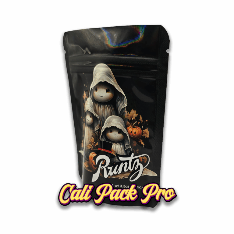 Ghost Runtz 3.5g Mylar Bag available in 1g, 3.5g, 7g, 14g, 28g, 112g, 224g, 448g, Food Grade PET + Aluminum, Glossy, Heat Seal + Zip Lock, Dry Herbs, Coffee, Edibles, Food Items.