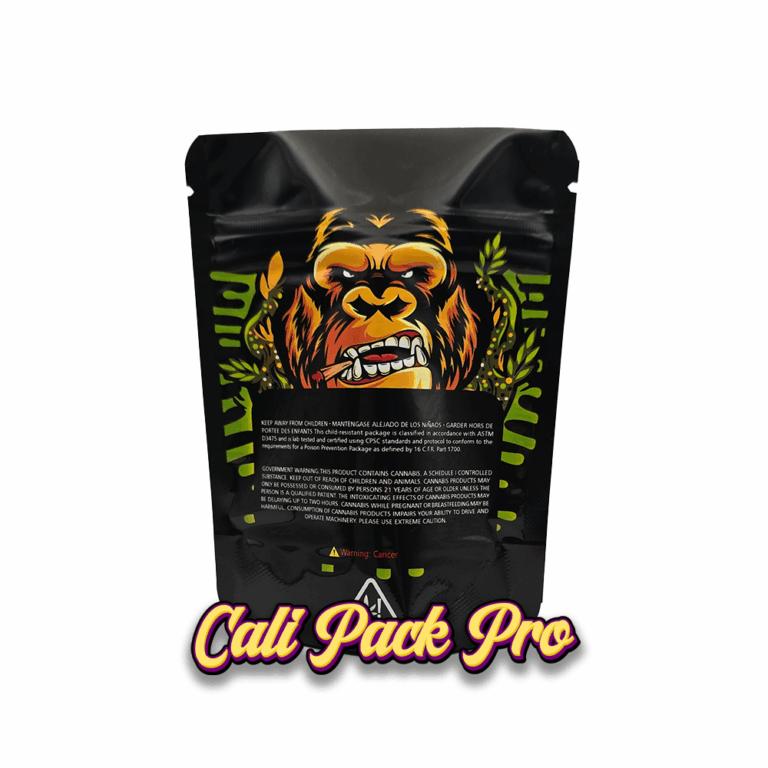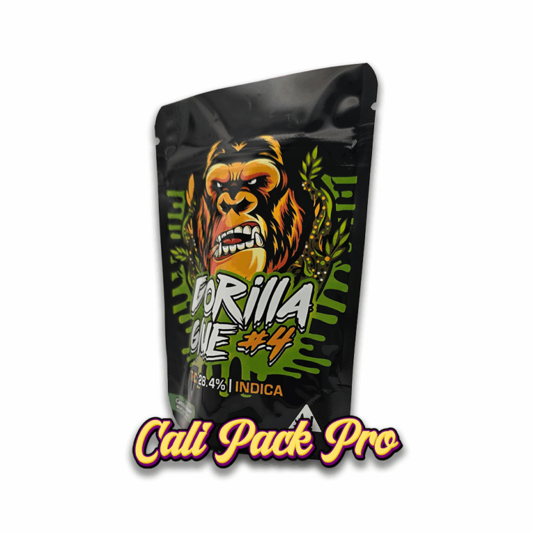Gorilla Glue 3.5g Mylar Bag available in 1g, 3.5g, 7g, 14g, 28g, 112g, 224g, 448g, Food Grade PET + Aluminum, Glossy, Heat Seal + Zip Lock, Dry Herbs, Coffee, Edibles, Food Items.