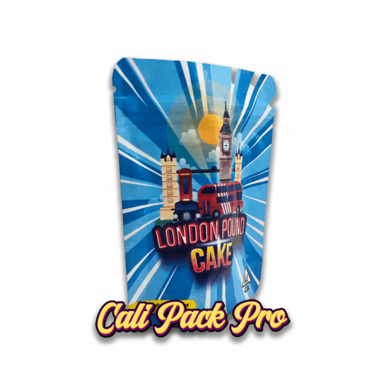 London Pound Cake 3.5g Mylar Bag available in 1g, 3.5g, 7g, 14g, 28g, 112g, 224g, 448g, Food Grade PET + Aluminum, Glossy, Heat Seal + Zip Lock, Dry Herbs, Coffee, Edibles, Food Items.