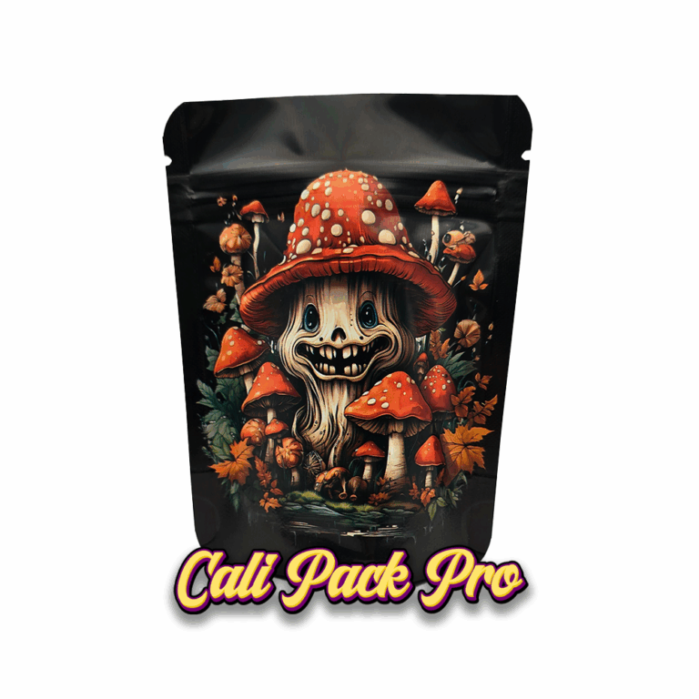 Mushroom Face 3.5g Mylar Bag available in 1g, 3.5g, 7g, 14g, 28g, 112g, 224g, 448g, Food Grade PET + Aluminum, Glossy, Heat Seal + Zip Lock, Dry Herbs, Coffee, Edibles, Food Items.