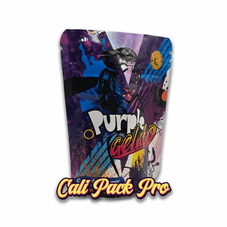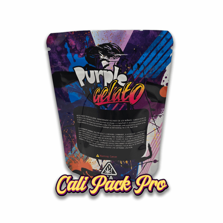 Purple Gelato 3.5g Mylar Bag available in 1g, 3.5g, 7g, 14g, 28g, 112g, 224g, 448g, Food Grade PET + Aluminum, Glossy, Heat Seal + Zip Lock, Dry Herbs, Coffee, Edibles, Food Items.