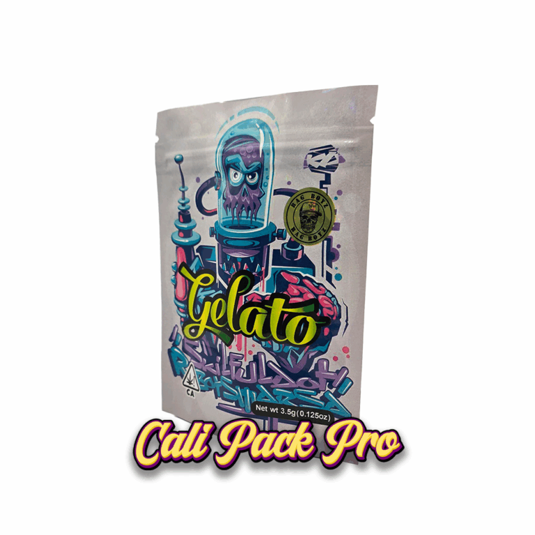Robo Gelato 3.5g Mylar Bag available in 1g, 3.5g, 7g, 14g, 28g, 112g, 224g, 448g, Food Grade PET + Aluminum, Glossy, Heat Seal + Zip Lock, Dry Herbs, Coffee, Edibles, Food Items.