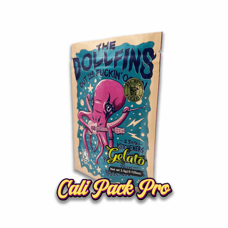 The Dolphins 3.5g Mylar Bag available in 1g, 3.5g, 7g, 14g, 28g, 112g, 224g, 448g, Food Grade PET + Aluminum, Glossy, Heat Seal + Zip Lock, Dry Herbs, Coffee, Edibles, Food Items.